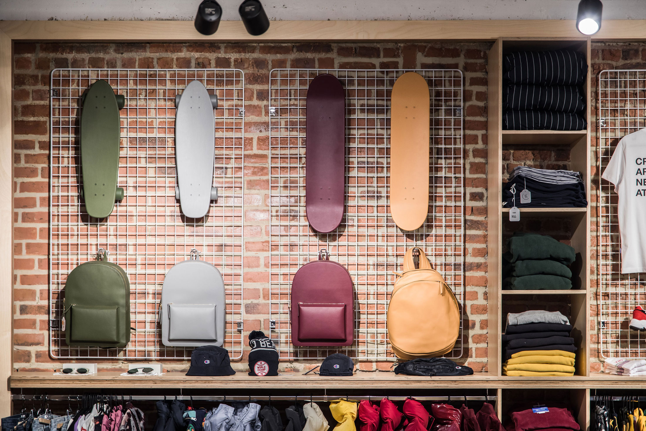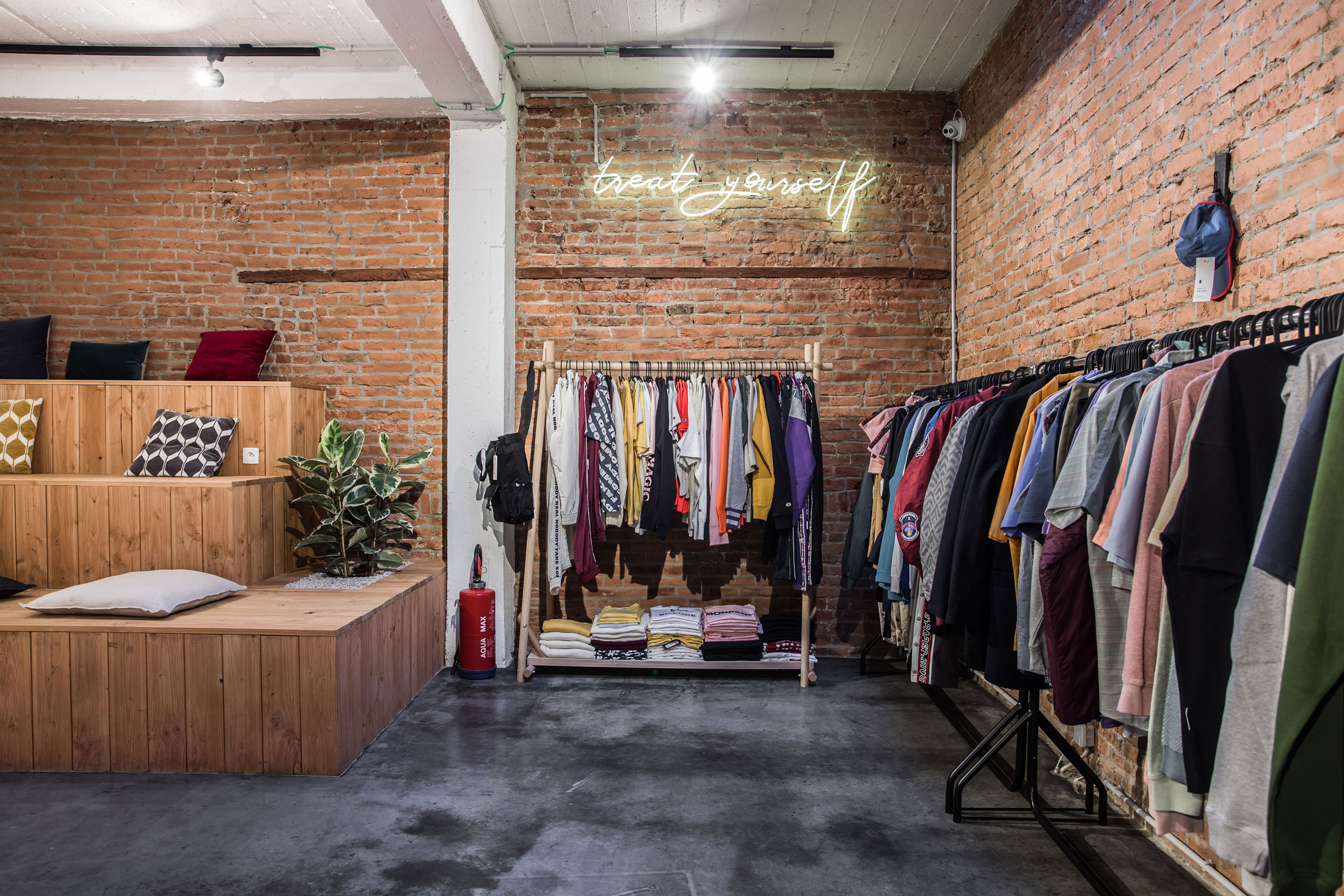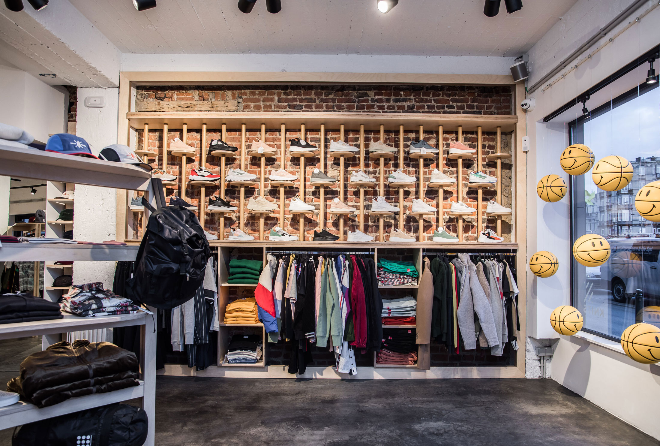 Centré autour du vêtement et de la culture sneakers, la demande était de penser un lieu hybride, entre boutique et café, où l’on viendrait autant pour découvrir les nouveautés que pour s’installer un moment. Nous voulions un espace vivant, capable de mêler vente, détente et rencontre. Un lieu de sociabilité où essayer les produits et discuter autour d’un café. Chaque zone devant dialoguer naturellement avec les autres: la vitrine, le bar, les assises, les présentoirs… créant un parcours continu, sans rupture. La lumière naturelle du fond de l’espace était un point fort, permettant de mettre en scène les produits et d’accueillir des shootings photo, tout en créant une atmosphère particulière et reconnaissable.